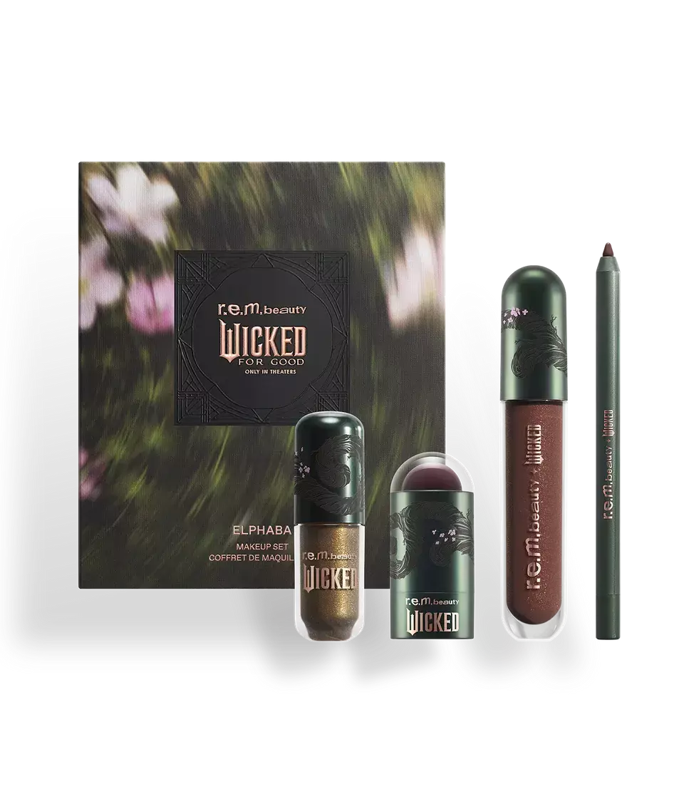 nosso conjunto de maquiagem r.e.m. beauty x Wicked: For Good elphaba oferece tudo o que é necessário para criar um look de rosto inteiro inspirado em sua presença mágica e poderosa. A sombra líquida em um verde floresta sedutor com pálpebras de pérolas marrons e champanhe em cores brilhantes. Aplique o blush e o batom para um flush de cor de ameixa luminosa que hidrata a pele. Termine o visual com um rico delineador de lábios marrom chocolate para definir os lábios e cubra com uma camada cintilante de bálsamo marrom quente brilhante com uma mudança de ameixa hipnotizante. Crie um visual ousado e corajoso ou um toque de cor para o dia a dia.